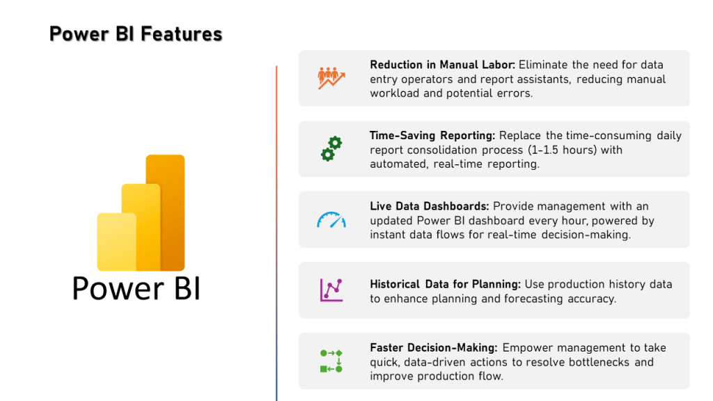 By integrating Power Apps, Power Automate, and Power BI, the factory gains a real-time, automated production monitoring system. This solution minimizes manual work, accelerates decision-making, and improves overall efficiency, productivity, and accuracy in reporting.